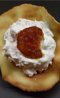 Once they are out of the oven, put them still hot between 2 small cups to make them concave. Whip together cream and mascarpone, add the nougat, fill the waffles and garnish with slices of caramelized oranges.